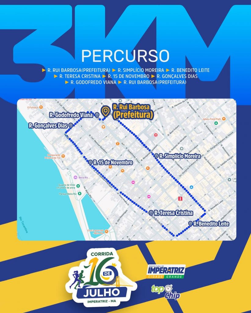 Prova de 3 km: Os corredores passaram pelas ruas Rui Barbosa, Simplício Moreira, Benedito Leite, Teresa Cristina, 15 de Novembro, Gonçalves Dias, Godofredo Viana e retornaram à Rui Barbosa.