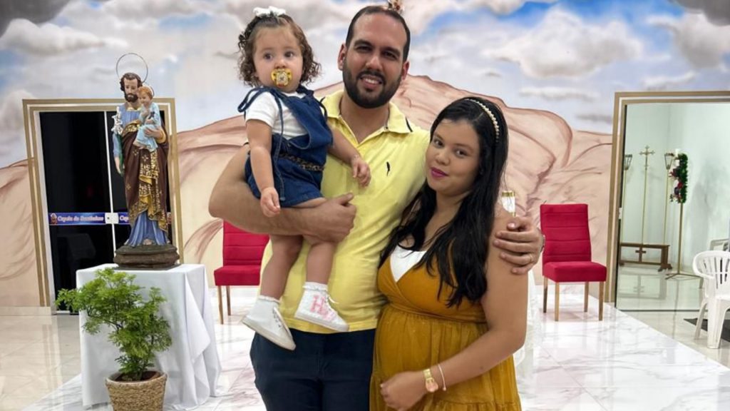 A pequena Helena Maria aparece nos braços dos pais durante cerimônia  religiosa em Imperatriz. Momentos como esse simbolizam o carinho e a esperança que inspiram a escolha dos nomes dos recém-nascidos da cidade.