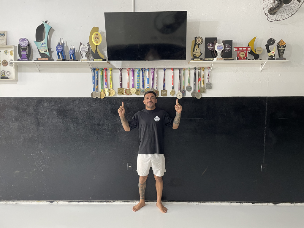 Rodrigo aponta para medalhas e troféus garantidos ao longo de sua carreira como lutador profissional de artes marciais