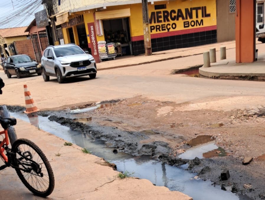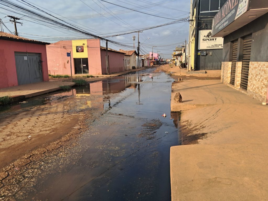 Situação atual da Rua Euclides da Cunha, no bairro Vila Nova, principal via de acesso ao centro da cidade, apresenta esgoto a céu aberto, causando desconforto e risco à população.