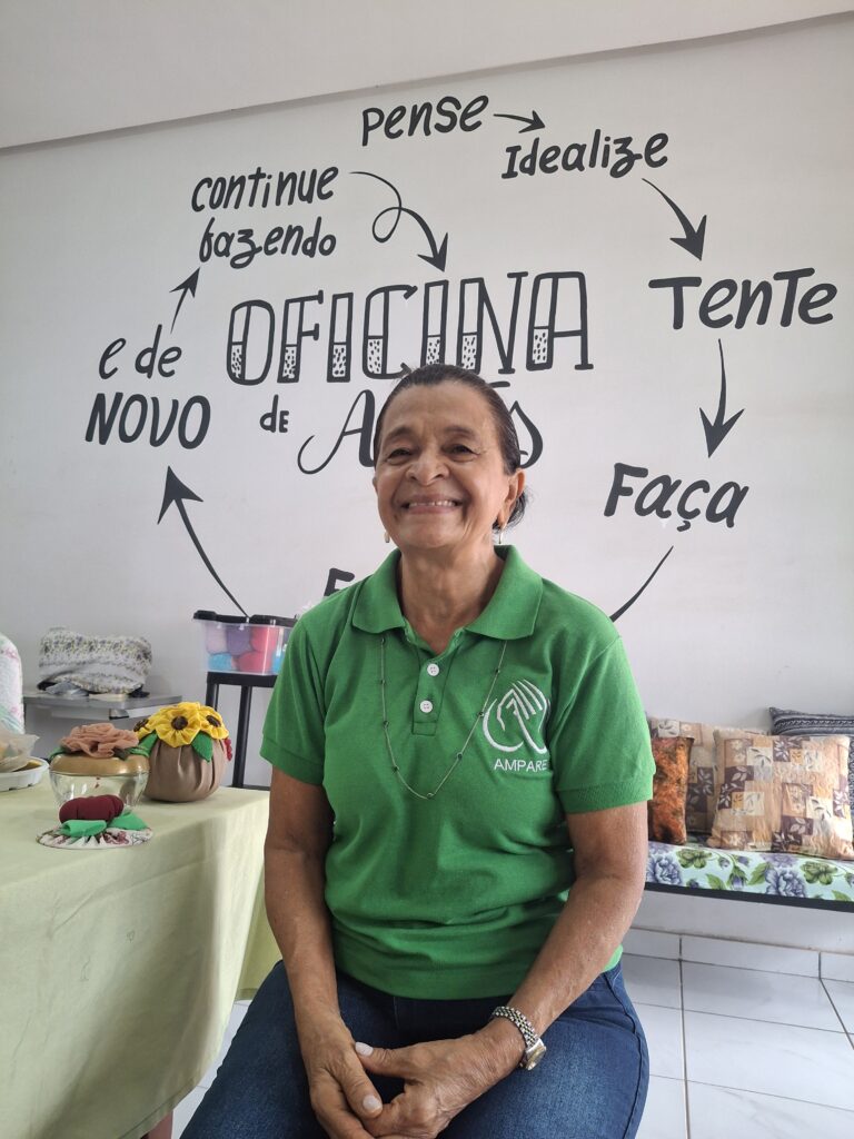 O tempo é uma das matérias-primas do voluntariado. A artesã Maria Neusa, de 75 anos, voluntária na Ampare desde 2006, transforma a angústia da espera em habilidade manual. Ela compreende que, para quem vem para Imperatriz em busca de cura, o ócio pode ser tão doloroso quanto a doença. Ela fala sobre uma doação de espumas de um rapaz que faz sofás, e os pacientes passam um bom tempo picando o material: “Porque eles ficam assim, entretidos com o tempo, né? Fazendo alguma coisa, ficam ansiosos. Eles choram, de saudade de casa, muito deixaram crianças… Para vir cuidar da mãe, aquela coisa. Então esse artesanato foi criado para isso, para envolver a mente do paciente”. Sob sua orientação, as mãos que antes lidavam apenas com a dureza da roça descobrem a delicadeza dos fios: “Eles fazem, né? Inclusive essas peças que a gente tem aqui, tudinho eles que fazem. Eu fico aqui só dando uma mãozinha, dando orientação”.