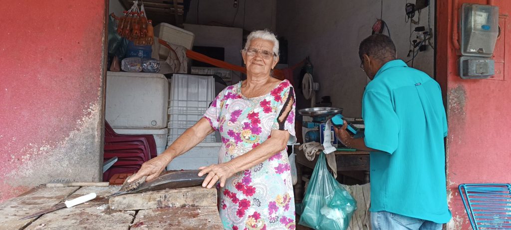 Nascida em Pernambuco e criada no interior maranhense, em São Domingos do Zé Feio (atualmente São Domingos do Maranhão), Maria chegou à Imperatriz em 1979 e se estabeleceu diretamente no bairro Santa Rita, vizinho ao Bom Sucesso. Desde então, construiu sua vida entre os dois bairros, com o trabalho como peixeira sendo seu elo mais forte com a comunidade. Há cerca de 30 anos, começou a vender peixe na Feira do Bom Sucesso, inicialmente em barracas improvisadas nos fins de semana. “A gente vendia ali no meio da feira, perto de uma farmácia que hoje nem existe mais. Era só nos finais de semana”, relembra.