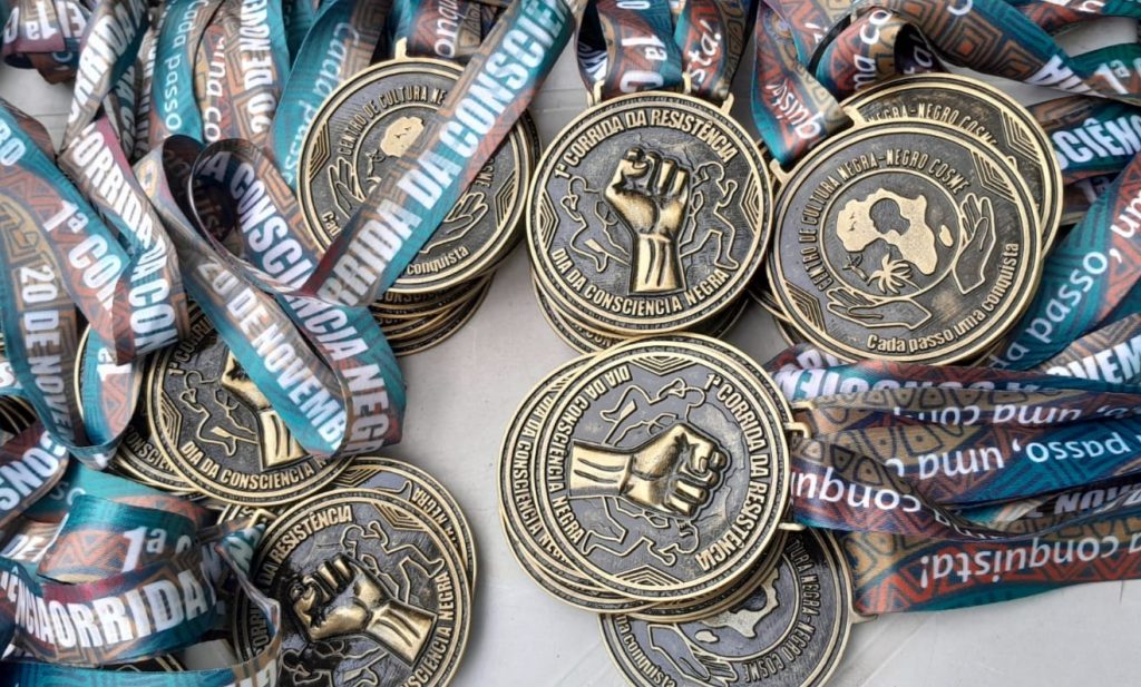 Os participantes da corrida receberam medalhas com o símbolo da ressintência negra.
