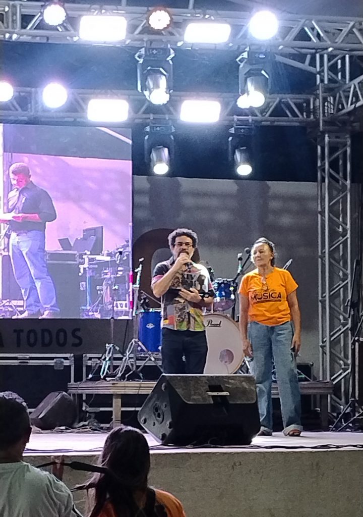 A cantora Glória Amorim, 29 anos, filha de Cruz Gago, que morreu em 2021, vítima de Covid, abriu a programação da última noite do festival e aproveitou a oportunidade para convidar os finalistas da competição ao palco para cantar a música “Tentei te esquecer” em homenagem ao pai. “Lembrar do meu pai é muito emocionante. Quando eu canto as canções dele, lembro de tudo que a gente viveu, dos momentos bons, da história dele”, desabafa Glória.